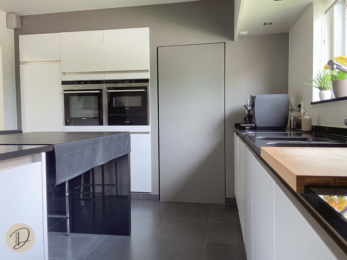 Aan de zijde van de hoge kolomkasten werd de deur naar de berging subtiel geïntegreerd in de kastenwand. Dit zorgt ervoor dat de deur zo min mogelijk opvalt en de eenheid van het design behouden blijft. Zowel de kasten als de bergingdeur zijn uitgevoerd met greeploze bediening, wat bijdraagt aan de strakke en moderne uitstraling van de ruimte.